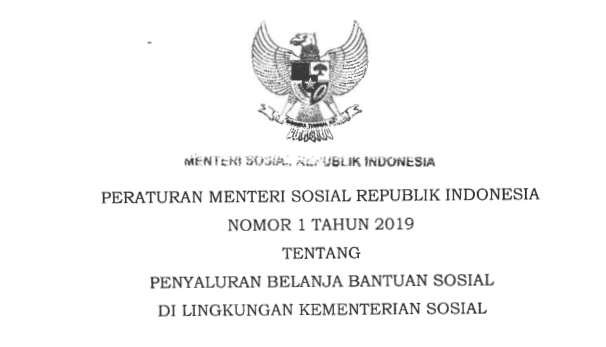 Permensos Nomor 1 Tahun 2019 Tentang Penyaluran Belanja Bantuan Sosial di Lingkungan Kementerian Sosial. Permensos Nomor 1 Tahun 2019 diterbitkan dengan pertimbangan bahwa untuk melaksanakan ketentuan Pasal 40 Peraturan Menteri Keuangan Nomor 254/PMK.05/2015 tentang Belanja Bantuan Sosial pada Kementerian/Lembaga, perlu menetapkan Peraturan Menteri Sosial tentang Penyalurari Belanja Bantuan Sosial di Lingkungan Kementerian Sosial.