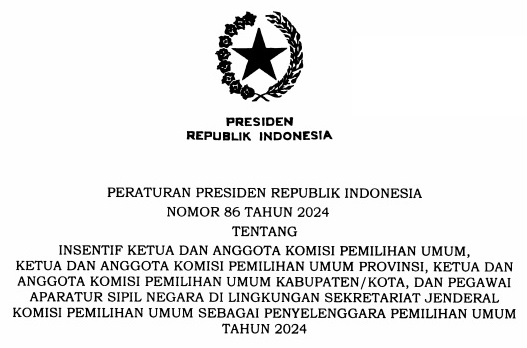 Peraturan Presiden Perpres Nomor 86 Tahun 2024 Tentang Insentif Ketua Dan Anggota Komisi Pemilihan Umum, Ketua Dan Anggota Komisi Pemilihan Umum Provinsi, Ketua Dan Anggota Komisi Pemilihan Umum Kabupaten/Kota, Dan Pegawai Aparatur Sipil Negara Di Lingkungan Sekretariat Jenderal Komisi Pemilihan Umum Sebagai Penyelenggara Pemilihan Umum Tahun 2024
